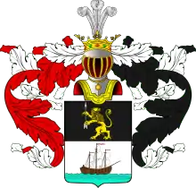 The shield is topped by a noble helmet and a crown with three ostrich feathers. The mantling on the shield is red and black, enclosed in silver.