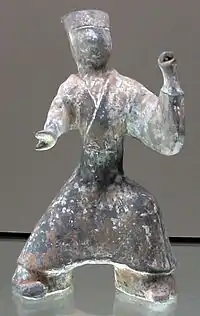 During the Song dynasty (960-1279), the tradition of burying protective wood or pottery figures of fangxiangshi in tombs was changed into figures made of perishable straw or bamboo. The Tang-Song handbook on burial practices, the Bicanq jing,[30] says the fangxiang figures were "woven in five colors, had four eyes and held tree branches in their hands". The official ritual of the Song dynasty[31] said funerals for officers of the four highest ranks could have one fangsiang exorcist, and those below in rank could only have a qitou ghost mask. This text also records that in 970, Emperor Taizu of Song decreed that for funerals in the capital of Kaifeng, "it was forbidden to all families who had a burial to perform, to occupy themselves with Taoist and Buddhist observances, or to employ a van of men masked as strange men or animals."