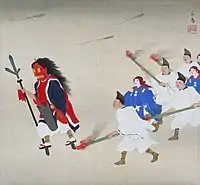 De Groot describes popular exorcising processions as "noisy, and even amusing, agreeably breaking the monotony of daily life" on the last day of the year, with boys wearing ghost-masks of old and young people and numerous gods and spirits, men dressed in costumes of fearsome door gods to scare away evil spirits, and male and female wu-shamans dancing with drums, all under the guidance of men and women acting as "fathers and mothers of the Nuo" ritual.[33]