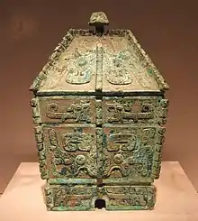 A fangyi (Chinese: 方彜; Wade–Giles: fang-i; 'square bronze') is a type of Chinese ritual bronze container typical of the Shang and early to middle Zhou periods of Bronze Age China (circa 1800-900 BCE). It takes the shape of a square or rectangular casket with a cover that resembles a hip roof, surmounted by a knob of a similar hipped appearance. The lower edge is typically indented with a semi-circular notch.[1]