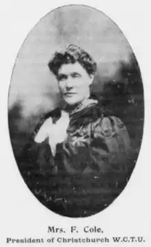 That same year during the presidency of Annie Jane Schnackenberg of Auckland, Fanny B. Cole started working for the national WCTU NZ as superintendent for Press Work.[17] By the next year, Cole was elected over incumbent Kate Sheppard as president of the Christchurch Union, a position she held until her ascendancy to the national presidency of the WCTU NZ. She was hailed for her leadership skills which included "conciliatory, tactful methods of procedure," and that meetings "were specially noticeable for the absence of anything approaching friction."[18]