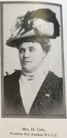 - See the letters protesting Cole's address about suffragettes in England – Hodgkinson, Edith (18 April 1912). "Correspondence – Letter to Editor". White Ribbon. 17 (202): 16. Retrieved 15 May 2021. and A Woman of New Zealand (18 June 1912). "The Suffragette". White Ribbon. 17 (204): 6. Retrieved 15 May 2021.