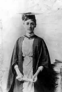 She started her degree in the Faculty of Arts but in her second year enrolled in the Faculty of Science. She graduated in the Great Hall at Sydney University on Saturday 14 April 1888, becoming the first woman to graduate with a Bachelor of Science degree from the University of Sydney. She was presented by Professor Liversidge to the Chancellor Sir William Manning who conferred the degree.[1]