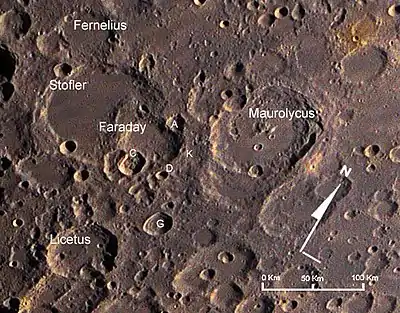 Faraday is a lunar impact crater in the southern highlands of the Moon. It was named after British chemist and physicist Michael Faraday.[1] It lies across the southeast rim of the larger crater Stöfler, and the northwest rim of Faraday forms a wide rampart across the otherwise flat floor of Stöfler. To the east of Faraday is Maurolycus.