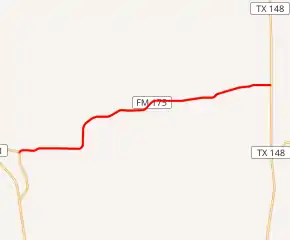 The western terminus of FM 175 is in northwestern Jack County at Loop 187, the former alignment of US 281 through Antelope.[2][3] The two-lane road travels to the east, then the north, and again to the east before entering Clay County. It passes through the community of Shannon before reaching its eastern terminus at SH 148.[1][4]