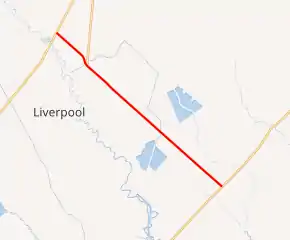 FM 2917 begins at FM 2004 between Hitchcock and Lake Jackson.[2] The route travels to the northwest, running parallel to and crossing branch lines of the Union Pacific Railroad to Monsanto and Solutia's Chocolate Bayou plants. Just north of a crossing of the busy Union Pacific main line, FM 2917 meets FM 2403 at a three-way stop. Past the intersection continues to the northwest, through Liverpool and to its northern terminus at SH 35 (future SH 99) southwest of Alvin.[1][3]