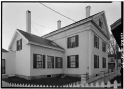 The Farnsworth Homestead is located in downtown Rockland, on the north side of Elm Street, between Union and Main Streets. It is located directly behind the main gallery of the Farnsworth Art Museum, which faces Main Street. The homestead consists of a main house and carriage house, which are connected by a series of ells. The house is a 2+1⁄2-story wood-frame structure, with a gabled roof and a foundation of granite and brick. The main block is finished in flushboard siding, while the ells and carriage house are clapboarded. The corners of the main block have pilasters, which rise to an encircling entablature. The building's gables are fully pedimented. The main entrance is recessed in the center of the three-bay front facade, framed by pilasters and a corniced entablature.[2]