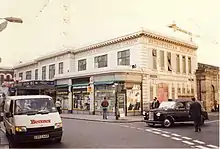 The station was relocated on 23 December 1865 when the Metropolitan Railway opened an extension to Moorgate. It was renamed Farringdon & High Holborn on 26 January 1922 when the new building by the architect Charles Walter Clark[9] facing Cowcross Street was opened, and its present name was adopted on 21 April 1936.[10] It was built in conjunction with a freight station to take livestock to a slaughterhouse to its south-east to supply Smithfield Market; remains of cattle ramps on a street outside the market, West Smithfield. Smithfield was redesignated as a wholesale 'deadmeat' market in the 19th century and the freight station was last used in the 1920s.