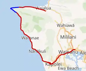 Farrington Highway is a major highway through the western part of O‘ahu in the U.S. state of Hawaii. Starting from Kamehameha Highway north of Pearl Harbor, it heads west along the island's southwestern and western coast; another part of the highway also serves the western part of the North Shore, ending in Waialua. With the exception of a gap around Kaena Point (which is a protected area and not accessible by car), the highway forms an almost continuous arc along the coast of the western half of the island of O‘ahu.[1]