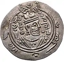 Farrukhan is the first Dabuyid ruler whose coins are known.[10][2][11] He imitated the coinage of the Sasanian King of Kings (shahanshah) Khosrow II (r. 590–628), albeit with some minor changes. His coins weighed half of the Sasanian coins, being around 2.05 grams. The legend was written in Middle Persian.[12] On the obverse, Farrukhan is wearing a crown with two wings attached to it, which is a reference to Verethragna, the god of victory.[13] The following rulers, Dadhburzmihr and Khurshid (r. 740–760) continued to mint the same pattern of coins, and eventually the Abbasid governors of Tabaristan.[14]