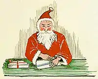 Even after the appearance of the store grotto, it was still not firmly established who should hand out gifts at parties. A writer in the Illustrated London News of December 1888 suggested that a Sibyl should dispense gifts from a 'snow cave',[77] but a little over a year later she had changed her recommendation to a gypsy in a 'magic cave'.[78] Alternatively, the hostess could "have Father Christmas arrive, towards the end of the evening, with a sack of toys on his back. He must have a white head and a long white beard, of course. Wig and beard can be cheaply hired from a theatrical costumier, or may be improvised from tow in case of need. He should wear a greatcoat down to his heels, liberally sprinkled with flour as though he had just come from that land of ice where Father Christmas is supposed to reside."[78]
