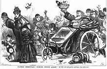 From the 1870s onwards, Christmas shopping had begun to evolve as a separate seasonal activity, and by the late 19th century it had become an important part of the English Christmas.[73] The purchasing of toys, especially from the new department stores, became strongly associated with the season.[74] The first retail Christmas Grotto was set up in JR Robert's store in Stratford, London in December 1888,[73] and shopping arenas for children—often called 'Christmas Bazaars'—spread rapidly during the 1890s and 1900s, helping to assimilate Father Christmas/Santa Claus into society.[73]