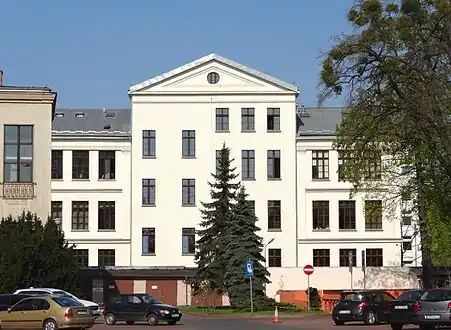 The building was erected in 1872 on a design by architect Müller, so as to house the civic school for boys (German: Bürgerschule).[6] The school was initially located in the former Bydgoszcz's Carmelites monastery. It was an elite folk school, with a 9 years cycle, and pupils usually belonged to wealthy high society, rich enough to pay the high tuition fees.[7] In the mid-1880s, the Bürgerschule moved further up in Konarskiego street, where is located today the Bydgoszcz School of Fine Arts (N°2),[8] or, according to the Prussian street numeration, from N°8 to N°7. The edifice has been rebuilt in 1901[9] In the 1990s, the edifice housed the Foreign Language Teacher Training College, which then moved to Dworcowa Street. Since 2010, the seat of the Kujawsko-Pomorskie Centre for Education and Kuyavian-Pomeranian Voivodeship Marshal's Office in Bydgoszcz are located here.