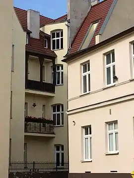 Initially Schule straße 2, it was owned by Albert Giese, who never lived in. The building was designed as a tenement house with flats for rent. In 1900, Richard Lampe, a physician living at Gdanska street N°35, bought the tenement: as a surgeon, specialized in women's diseases, he opened a clinic in the building.[25] In 1920, widowed Janina Zabłocka and her children moved there from the Eastern Borderlands at the end of WWI. His son Tadeusz will be a diplomat and a successful entrepreneur in England after WWII, in particular with his shipping company "Tazab", allowing Poles in exile to send parcels with food and medicines to their relatives in Poland.[26]