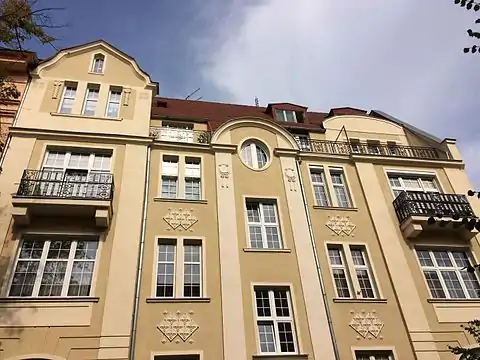 Referenced initially as Schulstraße 4/5, the building was conceived as a tenement house for flat renting. His first landlord was a dentist, Sallh Jacobowski, living at Danzigerstraße 165a (now Gdańska Street N°10).[27] It then became the property of various rentiers, and accommodated an average of 15 tenants till the outbreak of World War II. Anecdotal detail, a dentist practitioner is installed today in this building.