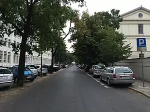 On the sidewalk grows a ginkgo identified as Natural landmark of Bydgoszcz.[10]