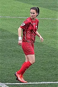 Fatma Kara debuted in the Turkey U-19 national team in the friendly match against Maceonian juniors on September 16, 2007.[14] She capped 32 times until April 2010, and played in the 2008, 2009 and 2010 qualification matches of UEFA Women's Under-19 Championship.[6][15][16][17]