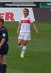 In 2007 still living in Germany, she was called up for the Turkey girls' U-17 national team, and made her debut in the friendly match against the Azeri team on May 27.[13] Until October 2007, she capped ten times in the youth national team, and participated also at the 2008 UEFA Women's U-17 Championship qualification round matches.[1]