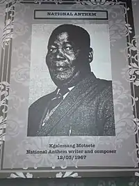 From the late 19th-century until the height of decolonisation during the 1960s, Bechuanaland (as it was then known) was a protectorate of the United Kingdom within its colonial empire.[4] In the run up to independence, proposals for the national symbols for the future country were made. Although the flag and the coat of arms were straightforward choices, the selection of the national anthem became a source of contention.[5] Despite its popularity, "Fatshe leno la rona" was reportedly not the frontrunner because its composer – Kgalemang Tumediso Motsete,[6][7] who possessed "a music degree from London"[5] – was the co-founder and leader of the opposition Botswana People's Party (BPP),[5][8][9] which at the time was a radical faction.[7] Instead, the government wanted to maintain "Morena boloka Sechaba sa Etsho" ("Lord protect the nation of the world") as the anthem after independence. Although the latter song was considered by some government officials to be a "colonial song",[5] it was in fact embraced by nationalists in the south of the continent in their struggle against colonialism, as well as in South Africa during the apartheid era.[5]