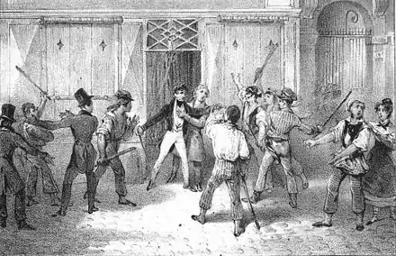 "-While the Swiss Guard lying in ambush in the houses of rue Saint-Honoré was organizing the rue de Richelieu, one could see the ladies from Lepage go out into the street to distribute lead and other metals to the brave citizens who were fighting uncovered amidst the bullets."[14]