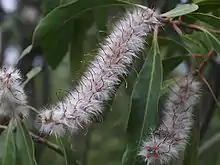 Its dark-grey to black bark is rough and deeply fissured, while the narrow drooping leaves are reminiscent of a willow (saligna meaning Salix-like). The timber was much-prized by the Voortrekkers for furniture and they named it Transvaal Boekenhout for its resemblance to European Beech. There are some 15 species of Faurea occurring in Africa and Madagascar.[2]