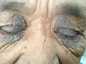 | Affected eyelids and upper cheeks with greyish discolouration. | |
