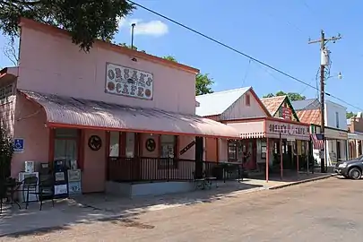 A former precinct courthouse, sits in the town square with extra wide 100-foot (30 m) curbed streets on its borders as specified in the original 1850 plat. Bounded by Main, Washington, Live Oak and Fayette streets the town square is the focus of commercial development. The remainder of the town is primarily residential. Typical commercial construction is wood frame block buildings many featuring false front parapets and awnings. Residential construction is typically modest single family homes on generous lots.[2]