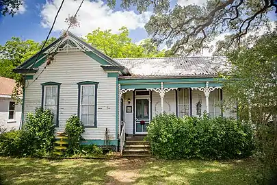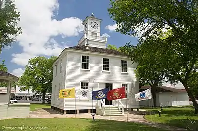 The Fayette County Precinct No. 2 Courthouse, built in 1880 is wood-frame construction with horizontal wood siding and has a simple two story square plan. The south elevation is the facade with simple wood stairs and solid wood panel double doors. Windows are symmetrically placed with three bays on the north and south, and two on the east and west.[2] Construction of the Victorian style building was funded by US$600 (equivalent to $16,848 in 2021) in contributions from the citizens of Fayetteville and an additional US$200 in tax funds from the County Commissioners' Court. Funding for painting the building was raised by holding a ball. A calaboose (holding jail) with two cells was finished in 1887.[3] A clock tower, financed by a ladies club, was added in 1934 in the center of the hipped roof.[2][3] It is no longer used as a courthouse. Precinct courthouses were quite rare in early Texas and this one was listed as an RTHL in 1997.[2] The other government building, the post office, is not considered historical, dating from the late 1960s.[2]