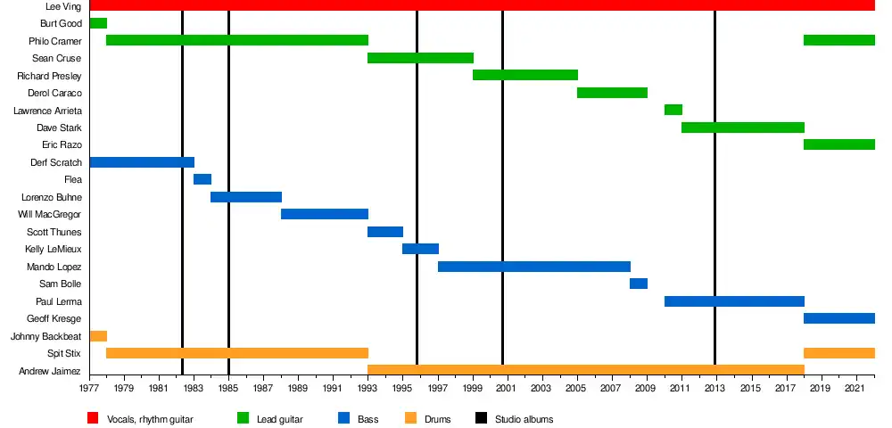 | Past members | Derf Scratch Burt Good Johnny Backbeat Eric Feldman Flea Lorenzo Buhne Will MacGregor Scott Thunes Kelly LeMieux Mando Lopez Sean Cruse Richard Presley Derol Caraco Jeffery “Beldo” Beller Sam Bolle Lawrence Arrieta Andrew Jaimez Paul Lerma Dave Stark Tommy Ufkes |