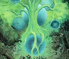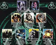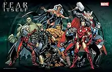 The storyline's title is a reference to a famous quote by Franklin D. Roosevelt: "So, first of all, let me assert my firm belief that the only thing we have to fear is fear itself—nameless, unreasoning, unjustified terror which paralyzes needed efforts to convert retreat into advance", as indicated by the use of a portion that quote as part of the soundtrack of the trailer presented during the Midtown press conference.[10] The story's antagonist is the Serpent, an Asgardian being who sows doubt and fear among the superheroes of the Marvel Comics Universe,[11] as illustrated by early promotional images for the event, which depict Spider-Man, Hulk, Captain America, Cyclops, Thor, and Iron Man coming face to face with their worst nightmares.[1][12] During this conflict, which is referred to among the characters as the Serpent's War,[13] the Serpent is revealed to be Cul, Odin's brother, who assumed the throne of Asgard following the death of their father. Born at the dawn of time, Cul was subsequently banished and imprisoned by Odin following Cul's corrupt rule, and a prophecy by Yggdrasil that cost Odin his right eye, and which revealed that Cul's madness could only be cured by the death of Odin's son.[14][15]
