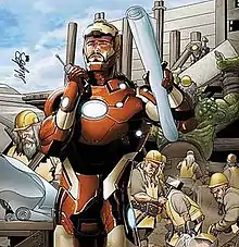 The Invincible Iron Man follows Iron Man as he travels to Paris to confront Grey Gargoyle who, as Mokk: Breaker of Faith, has turned the populace to stone.[41] After Iron Man's rival Detroit Steel meets with the same fate, and Iron Man's armor and energy supply are compromised,[42] Tony Stark uses Odin's Workshops of Svartalfheim to make weapons to fight the Worthy, as pro-Serpent forces conspire against him.[43][44][45] In Paris, Rescue comes into conflict with Sasha Hammer and her team of Steelmechs, but both are confronted by Mokk as well.[43] Mokk leaves Paris, however, when the Serpent summons his Worthy to join him at the portal to Asgard in Broxton, while Iron Man returns to Earth with the Asgardian weapons.[46]