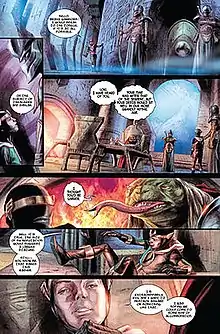 At Comics Bulletin, a roundtable review of issue #1 by five reviews resulted in an average rating of 3.7 out of 5 bullets. The reviewers generally praised the writing and art, though Ray Tate, who expressed an aversion to large-scale "event" storylines, questioned the first issue's execution, and perceived out-of-character behavior on the part of Odin. Norse mythology fan Thom Young stated that certain elements did not resonate or ring true to him.[141] Danny Djeljosevic gave issue #2 a rating of 3.5 bullets, again praising the tension-building of the story and the art.[142] For issue #3, Shawn Hill rated it 3.5, stating that art and characterization justified continued patronage of the series, but that the plot did not, while Sam Salama Cohén exhibited an overall more positive reaction, with 4.5 bullets.[143] Djeljosevic gave 4 bullets to issue #4, complimenting Fraction for hitting his stride as he scripted "the most technically daunting task in his comics career", and singling out the parallel scenes of Odin and the Serpent rallying their troops in particular. Like Doug Zawisza, Djeljosevic was impressed by Stuart Immonen's ability to effectively render different subjects, from sleepy seaside Canadian towns to superhero battles, and remarking, "Immonen is easily the most versatile artist in comics, who will surely go down as one of the greats with his striking layouts and dynamic, varied panel to panel storytelling. Immonen reminds me of the old-school Marvel Comics artists, who were capable of delivering strong, consistent work every month with little need for fill-ins."[144]