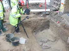 Features have a specific stratigraphic context as well as helping to provide details of context for artifacts. Often times an artifact's provenience can be defined in part by the feature it is associated with (if such a feature exists).[2] In circumstances where a stratigraphic layer cannot be defined by soil color or consistency, such as in the excavation of several features such as wells or cisterns, arbitrary layers can be defined by an archaeologist based on equal levels of depth, allowing for the categorization of artifacts based on relative placement within a feature.[2]