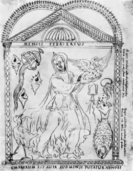 Februarius was the only month in the pre-Julian calendar to have an even number of days, numbering 28.[3] This was mathematically necessary to permit the year itself to have an odd number of days.[4] Ancient sources derived Februarius from februum, a thing used for ritual purification. Most of the observances in this month concerned the dead or closure, reflecting the month's original position at the end of the year. The Parentalia was a nine-day festival honoring the ancestors and propitiating the dead, while the Terminalia was a set of rituals pertaining to boundary stones that was probably also felt to reinforce the boundary of the year.[5]