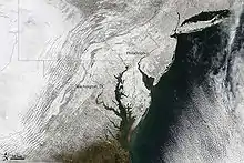 The February 9–10, 2010 North American blizzard was a winter and severe weather event that afflicted the Midwest, Mid-Atlantic and New England regions of the United States between February 9–11, 2010, affecting some of the same regions that had experienced a historic Nor'easter three days prior. The storm brought 10 to 20 inches (25 to 51 cm) of snow across a wide swath from Washington, DC to New York City, with parts of the Baltimore metro area receiving more than 20 inches (51 cm).[1] This storm began as a classic "Alberta clipper", starting out in Canada and then moving southeast, and finally curving northeast while rapidly intensifying off the New Jersey coast, forming an eye. The National Weather Service, in an interview with The Baltimore Sun's weather reporter Frank Roylance, likened this storm to a Category 1 hurricane. Forecasters told Roylance that "Winds topped 58 mph over part of the Chesapeake Bay, and 40 mph gusts were common across the region as the storm's center deepened and drifted slowly along the mid-Atlantic coast".[2] This storm system, in conjunction with the first storm 3 days prior, has been nicknamed Snoverkill.