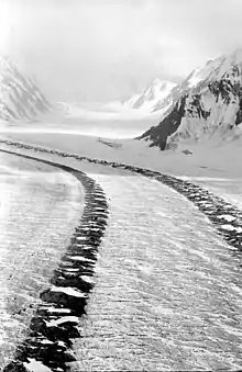 The Fedchenko Glacier (Russian: Ледник Федченко) is a large glacier in the Yazgulem Range, Pamir Mountains, of north-central Gorno-Badakhshan province, Tajikistan. The glacier is long and narrow, currently extending for 77 kilometres (48 mi) and covering over 700 square kilometres (270 sq mi). It is the longest glacier in the world outside of the polar regions.[1] The maximum thickness of the glacier is 1,000 metres (3,300 ft), and the volume of the Fedchenko and its dozens of tributaries is estimated at 144 cubic kilometres (35 cu mi)—about a third the volume of Lake Erie.