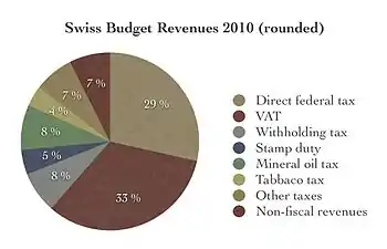 The lion's share of the money the confederation has at its disposal comes from the federal taxes it collects. For the year 2010 92.6% of all the confederations income (a total of 62.833 billion CHF) were gained from tax revenues. The largest part of it, 32.9% came from the value-added tax (VAT). The second most important tax revenue in 2010 was the direct federal tax which contributed 28.5% of the whole budget. Additionally the withholding tax (7.5%), the mineral-oil tax (8.2%), the stamp duty (4.5%) and the tobacco tax (3.7%) as well as other taxes (7.2%) added to the total federal budget.[12]