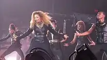 Jackson performed "Feedback" on Good Morning America, The Ellen DeGeneres Show, and MTV's TRL.[46] "Feedback" and several other songs were scheduled to be performed on Saturday Night Live, but Jackson was required to cancel due to illness.[47][48] Performances on Jimmy Kimmel Live and London nightclub G-A-Y were also initially planned.[49] Jackson taught the video's choreography to Larry King during an appearance on Larry King Live.[50] It was later performed on the Rock Witchu Tour, Number Ones, Up Close and Personal, Unbreakable World Tour, and the 2017–2019 State of the World Tour. The performance on TRL became Jackson's first appearance on MTV in six years, following a lengthy period in which the network blacklisted Jackson and her music videos after they were fined regarding her controversial Super Bowl performance incident. MTV News called the performance "fantastique", with the audience "completely losing their cot-damn marbles."[51] Jackson's rendition on Number Ones, Up Close and Personal was called "throbbing" by The Courant, noting its "explicit dance moves".[52] Jackson also included the song on her 2019 Las Vegas Residency Janet Jackson: Metamorphosis.