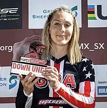 Felicia Stancil (born May 18, 1995) is an American female BMX rider. Stancil has won 14 UCI World Titles including the 2012 UCI BMX World Championships titles for Junior Women and the Junior Women Time Trial in Birmingham, United Kingdom.[2] A year later she successfully defended both titles at the 2013 UCI BMX World Championships in New Zealand.[3] At the 2015 Pan American Games, Stancil won gold in her first international win as a professional. The win resulted in the first gold medal won by the United States at the 2015 games.[4] After reaching the final in all ten races on the 2019 UCI BMX Supercross World Cup series, Stancil finished out the year 2nd in the overall standings.[5] Adding on to her successful 2019, Stancil was awarded the 2019 Golden Crank Pro of the Year Title by Pull Magazine.[6]