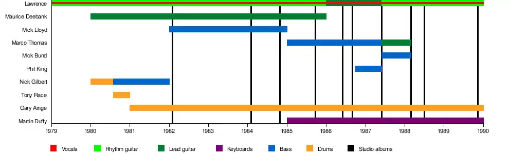 - Lawrence – vocals and guitar (1979–1989)