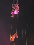 A video interlude in which the stalker talks about femme fatales throughout history introduces the third section of the show. Spears returns to the stage wearing a golden outfit and performs an Egyptian-inspired version of "Gimme More", which includes the use of pyrotechnics. In her next number "(Drop Dead) Beautiful" Spears is surrounded by her dancers carrying picture frames, and includes an appearance by Sabi in select cities. She then sings "He About to Lose Me" on a purple couch while her male dancers climb metallic structures. She wears a golden cape for a snake charming number of "Boys" (The Co-Ed Remix).[34] After climbing into a swing, she starts singing "Don't Let Me Be the Last to Know", while an acrobat hangs from it.[33] Another video interlude follows, featuring Spears changing clothes and choosing between different passports inside a hotel room. The show’s final segment features Spears and her dancers dressed in motorcycle gear to perform a medley of "...Baby One More Time" and "S&M", while her next number "Trouble for Me" features Spears and her dancers performing in the B-stage.[34] Accompanied by her female dancers, Spears performs "I'm a Slave 4 U" with gay soft porn in the backdrops,[35] and subsequently a cover of Madonna's "Burning Up" sitting atop a giant silver guitar.[33] She then brings several fans onstage for a performance of "I Wanna Go". She performs "Womanizer" with her dancers dressed as policemen and thanks the audience.[36] The encore starts with a video interlude of "Scary". The video ends with Spears finally capturing the stalker while wearing a kimono. She reappears to perform a martial arts-inspired version of "Toxic", in which she defeats a group of ninjas. At the end of the song, she goes below the stage and returns wearing a black sparkly bodysuit for "Till the World Ends". Halfway through the performance, Nicki Minaj appears on the backdrops rapping her verse of The Femme Fatale Remix of the song. She also joined Spears to perform the verse in select cities. After the song changes back to the original version, Spears starts flying on a platform with giant angel wings. The show ends with Spears and her dancers thanking the audience, as confetti falls and the "Femme Fatale" sign is lowered onstage.[33]