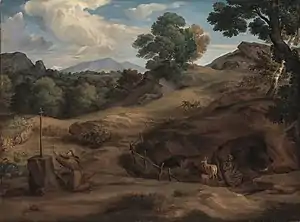 In 1810 he returned to Dessau. He toured the Harz Mountains with his brother, Friedrich, before settling in Vienna in 1811.[2] There he got to know, and came under the influence of, the landscape painter Joseph Koch.[1] Fritz Novotny contrasts Olivier's paintings of this period – "artificial landscapes with their wings – typical Nazarene work" – with the precise, closely observed drawings he made of the suburbs of Vienna at the same time in which he shows "by means of things small and insignificant in themselves, the might of the invisible forces of nature, the infinity and silence of space".[4]