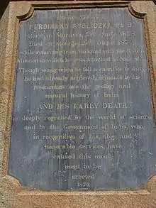Stoliczka studied geology and palaeontology at Prague and the University of Vienna under Professor Eduard Suess and Dr Rudolf Hoernes. He graduated with a Ph D from the University of Tübingen on 14 November 1861.[6] His early works were studies on some freshwater mollusca from the Cretaceous rocks of the north-eastern Alps about which he wrote to the Vienna Academy in 1859. His scientific career proper started in the Austrian Geological Survey, which he joined in 1861, and his first papers there were based on work in the Alps and Hungary.[4]