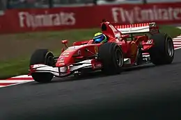 An aerodynamic upgrade introduced for the San Marino Grand Prix brought the pace of the car to approximately level with the Renault. At the United States Grand Prix, in Indianapolis, Ferrari were dominant all weekend, resulting in the first Ferrari one-two finish since the same race 12 months beforehand. This seemed to represent a genuine turning point for the car's competitiveness. Modifications throughout the season continued to improve the car's performance, to the point where it was considered the fastest package of all for the remainder of the season – the car won 7 of the last 9 races of the season.[2] Massa claimed his maiden win at the Turkish Grand Prix and later won his home race in Brazil. As a result of the car's improved form, Ferrari and Schumacher were able to close the gap to Renault and Fernando Alonso in their respective championships. However, Schumacher suffered an engine failure while leading the Japanese Grand Prix which effectively ended his title hopes and Ferrari eventually lost out on the Constructor's title by only 5 points to Renault. The 248 did give Schumacher his final Formula 1 win in China.[5]