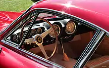 While 250 GT Lusso was a civilized sport car, it was nevertheless "recommended in preference to young and flexible passengers" due to the fixed-position seatbacks. Despite this, the pedals were adjustable to 5 cm (2.0 inches), as in the racing versions.[18] The design of the instrument panel, covered with soft and black leather was unusual; the tachometer, with a red zone beginning at 8,000 rpm, and the speedometer were placed at the center slightly tilted towards the driver. Five additional gauges were positioned in front of the driver, behind the three-spoke Nardi steering wheel made of wood and aluminum, placed almost vertically.[13][19]