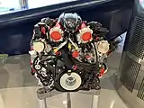 The F154 V8 engines have a 90° angle between the cylinder banks, aluminium block and heads. The forced induction system uses two parallel twin-scroll water-cooled turbochargers supplied by IHI[1] and two air-to-air intercoolers. The valvetrain consists of 4 valves per cylinder actuated through roller finger followers by two overhead camshafts per bank; the timing chain is located on the flywheel side. All versions feature gasoline direct injection and continuously variable valve timing on both intake and exhaust side.