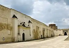 Approaching from the west (from the modern Ville Nouvelle or "New City"), the city's main entrance is at Bab al-Amer, on the western edge of the former Jewish Mellah.[4][2] This is also the location of the modern Place des Alaouites ("Plaza/Square of the Alaouites") and of the famous Gates of the Royal Palace, which were built in the 1960s and early 70s but are much-celebrated for their craftsmanship.[2][13] From this point, a main road (Rue des Mérinides or Rue Boukhessissat) runs eastwards between the Mellah and the walls of the Royal Palace.[6] This area, along with the rest of the former Jewish quarter, is also known for its distinctive house architecture, with open balconies and other features not usually found in the traditional Muslim medina.[18][2] The Mellah in turn has its own main street, a gate known as Bab el-Mellah, and a large Jewish Cemetery (established in 1883) at its southwestern corner.[10][20][4]