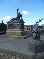 The war memorial, a bronze figure of a fallen officer telling his men to "carry on" is by Birnie Rhind, 1919.[40]