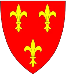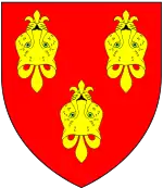 - Sir Nicholas de Cantilupe (d.1266), 5th son, who married Eustachia FitzHugh, heiress of Greasley Castle in Nottinghamshire, which he made his seat. His son and heir was William de Cantilupe, 1st Baron Cantilupe (1262-1308) of Ravensthorpe Castle in the parish of Boltby, North Yorkshire, who was created a baron by writ on his summons to Parliament in 1299.[16] He married Eva de Boltby, heiress of Ravensthorpe and Boltby. He signed and sealed the Barons' Letter of 1301 as Will(ielm)us de Cantilopo, D(omi)n(u)s de Ravensthorp and was present at the Siege of Caerlaverock Castle in 1300, during which his arms were recorded in verse on the Roll of Caerlaverock, blazoned in standard form as: Gules, a fess vair between three leopard's faces jessant-de-lys or, still visible sculpted on the chest tomb supporting the effigy of the 3rd Baron (younger son of the 1st Baron) in Lincoln Cathedral.[17] The male line died out on the death of the latter's son the 4th Baron in 1375.