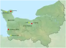 The de Cantilupe family which came to England at some time after the Norman Conquest of 1066 originated at one of three similarly named manors in Normandy, from which they took their name: Canteloup in Calvados, east of Caen;[10] Canteloup in Manche east of Cherbourg on the eastern tip of the Cherbourg Peninsula (Cotentin); or Chanteloup in Bréhal,[11] Manche, on the south-west side of the Cherbourg Peninsula, favoured by most sources as an ancient castle survives there. The place-name, common throughout France, signifies "wolf-song" which at such places was commonly heard.